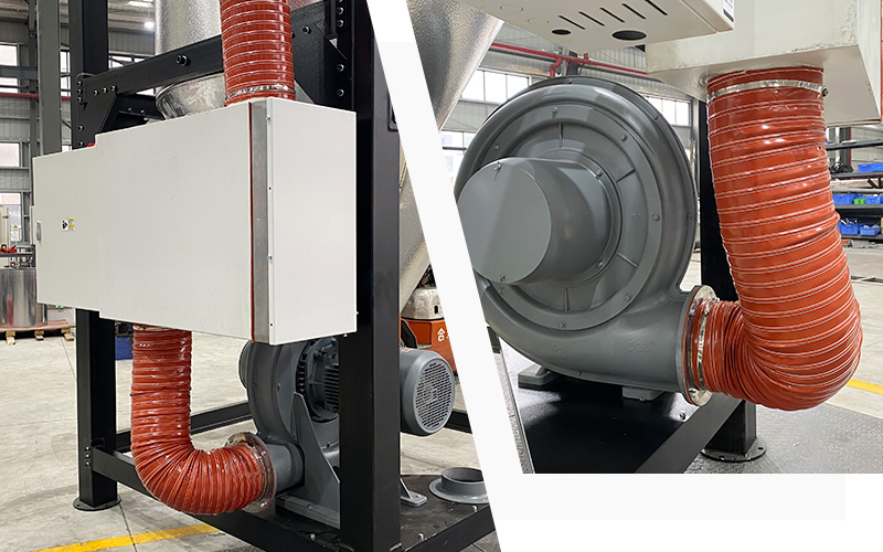 The drying barrel with down-blowing air pipe design and cyclone exhaust device prevents heat loss and evenly disperses hot air to keep the plastic dry. At the same time, the feeding system with closed loop is equipped to prevent the dried raw materials from getting damp again due to contact with the outside air, thereby improving the drying effect.